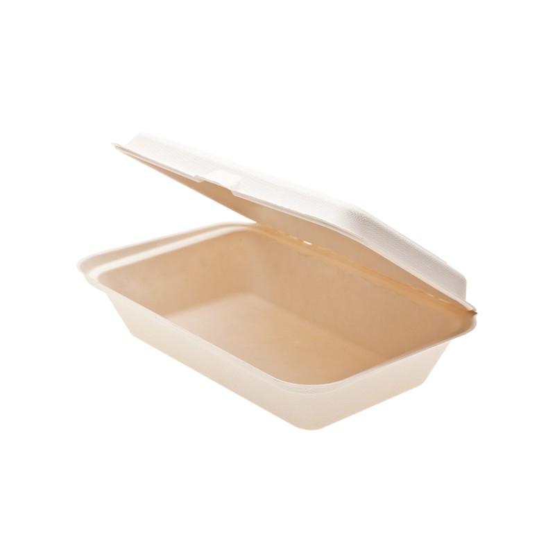 Contenitore monouso con coperchio in polpa di cellulosa prodotto con fogli di polpa di cellulosa ottenuti dalla fibra del gambo della canna da zucchero, dopo essere stata utilizzata per la produzione dello zucchero. In questo modo, non solo si utilizza una risorsa rinnovabile, ma non vengono tagliati ulteriori alberi per ricavare la cellulosa; è pertanto al 100% naturale, completamente biodegradabile e compostabile secondo norma EN13432